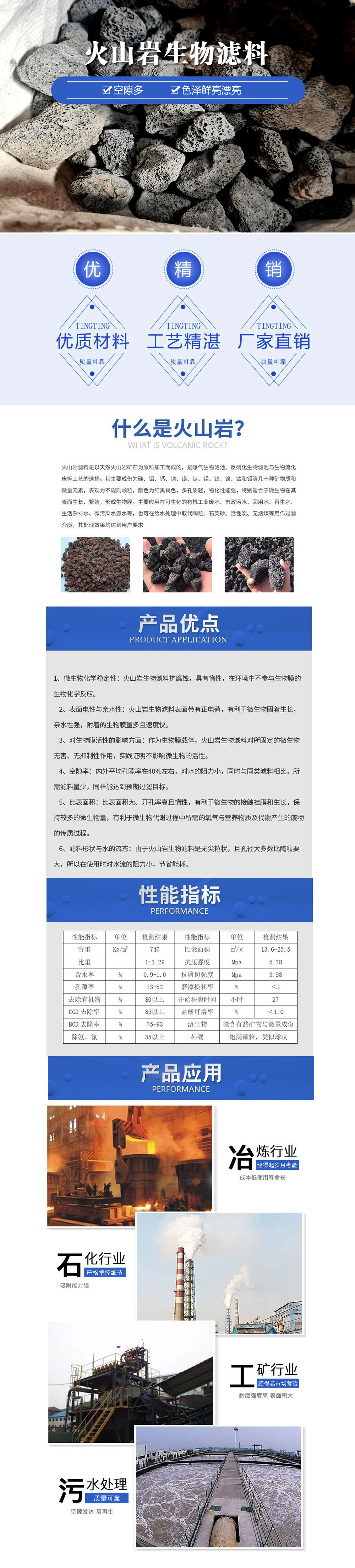 火山巖生物濾料是由火山巖礦石,經(jīng)過選礦、破碎、篩分、研磨等一系列工藝加工而成的粒狀濾料,其主要成份為硅、鋁、鈣、鈉、鎂、鈦、錳、鐵、鎳、鈷和鉬等幾十種礦物質(zhì)和微量元素,表觀為不規(guī)則顆粒,顏色為紅、黑褐色,多孔質(zhì)輕,特別適合于微生物在其表面生長(zhǎng)、繁殖,形成生物膜。